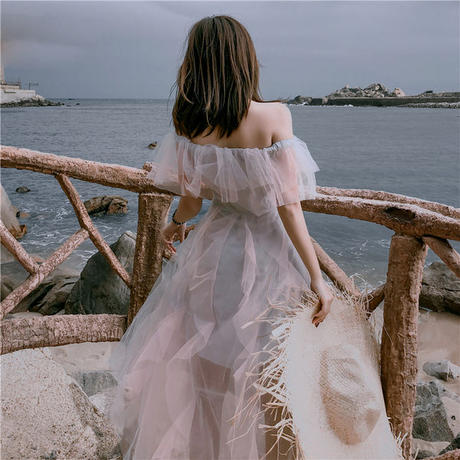 ワンピース 韓国ドレス 大人可愛いオフショルダーシースルーロングワンピ Hdfks